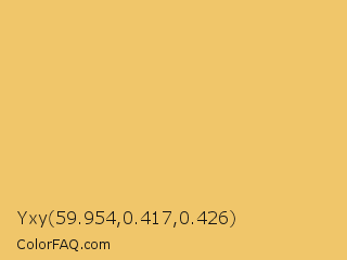 Yxy 59.954,0.417,0.426 Color is a light orange color and the nearest color is Rob Roy #eac674. Hex code #f0c66a and RGB value is rgb(240,198,106). In RGB color space, this color is composed of 94% red, 78% green, 42% blue, In CMYK color space, this color is composed of 0% cyan, 18% magenta, 56% yellow , 6% black , In HSL color space, this color has a hue angle of 41° , 82% saturation and 68% lightness.