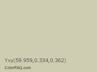 Yxy 59.959,0.334,0.362 Color is a light yellow color and the nearest color is Foggy Gray #cbcab6. Hex code #cecdb1 and RGB value is rgb(206,205,177). In RGB color space, this color is composed of 81% red, 80% green, 69% blue, In CMYK color space, this color is composed of 0% cyan, 0% magenta, 14% yellow , 19% black , In HSL color space, this color has a hue angle of 58° , 23% saturation and 75% lightness.