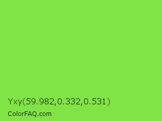 Yxy 59.982,0.332,0.531 Color is a normal green color and the nearest color is Kiwi #8ee53f. Hex code #80e346 and RGB value is rgb(128,227,70). In RGB color space, this color is composed of 50% red, 89% green, 27% blue, In CMYK color space, this color is composed of 44% cyan, 0% magenta, 69% yellow , 11% black , In HSL color space, this color has a hue angle of 98° , 74% saturation and 58% lightness.