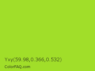 Yxy 59.98,0.366,0.532 Color is a normal green color and the nearest color is Atlantis #97cd2d. Hex code #a1de29 and RGB value is rgb(161,222,41). In RGB color space, this color is composed of 63% red, 87% green, 16% blue, In CMYK color space, this color is composed of 27% cyan, 0% magenta, 82% yellow , 13% black , In HSL color space, this color has a hue angle of 80° , 73% saturation and 52% lightness.
