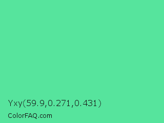 Yxy 59.9,0.271,0.431 Color is a light green color and the nearest color is Medium Aquamarine #66ddaa. Hex code #56e49d and RGB value is rgb(86,228,157). In RGB color space, this color is composed of 34% red, 89% green, 62% blue, In CMYK color space, this color is composed of 62% cyan, 0% magenta, 31% yellow , 11% black , In HSL color space, this color has a hue angle of 150° , 72% saturation and 62% lightness.