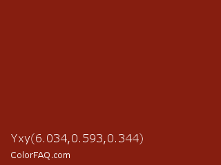 Yxy 6.034,0.593,0.344 Color is a dark red color and the nearest color is Falu Red #801818. Hex code #861e10 and RGB value is rgb(134,30,16). In RGB color space, this color is composed of 53% red, 12% green, 6% blue, In CMYK color space, this color is composed of 0% cyan, 78% magenta, 88% yellow , 47% black , In HSL color space, this color has a hue angle of 7° , 79% saturation and 29% lightness.