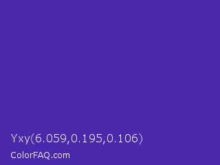 Yxy 6.059,0.195,0.106 Color is a normal indigo color and the nearest color is Daisy Bush #4f2398. Hex code #4a29ad and RGB value is rgb(74,41,173). In RGB color space, this color is composed of 29% red, 16% green, 68% blue, In CMYK color space, this color is composed of 57% cyan, 76% magenta, 0% yellow , 32% black , In HSL color space, this color has a hue angle of 255° , 62% saturation and 42% lightness.