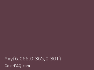 Yxy 6.066,0.365,0.301 Color is a dark rose color and the nearest color is Eggplant #614051. Hex code #5e3c47 and RGB value is rgb(94,60,71). In RGB color space, this color is composed of 37% red, 24% green, 28% blue, In CMYK color space, this color is composed of 0% cyan, 36% magenta, 24% yellow , 63% black , In HSL color space, this color has a hue angle of 341° , 22% saturation and 30% lightness.