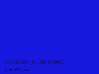 Yxy 6.067,0.155,0.068 Color is a normal blue color and the nearest color is Bluebonnet #1c1cf0. Hex code #1817de and RGB value is rgb(24,23,222). In RGB color space, this color is composed of 9% red, 9% green, 87% blue, In CMYK color space, this color is composed of 89% cyan, 90% magenta, 0% yellow , 13% black , In HSL color space, this color has a hue angle of 240° , 81% saturation and 48% lightness.