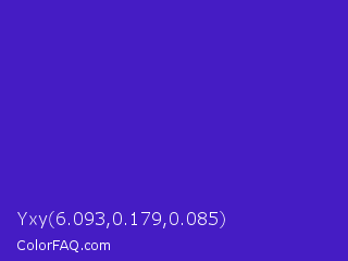 Yxy 6.093,0.179,0.085 Color is a normal indigo color and the nearest color is Interdimensional Blue #360ccc. Hex code #451cc4 and RGB value is rgb(69,28,196). In RGB color space, this color is composed of 27% red, 11% green, 77% blue, In CMYK color space, this color is composed of 65% cyan, 86% magenta, 0% yellow , 23% black , In HSL color space, this color has a hue angle of 255° , 75% saturation and 44% lightness.