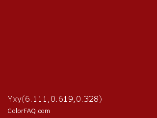 Yxy 6.111,0.619,0.328 Color is a dark red color and the nearest color is Sangria #92000a. Hex code #8f0b0e and RGB value is rgb(143,11,14). In RGB color space, this color is composed of 56% red, 4% green, 5% blue, In CMYK color space, this color is composed of 0% cyan, 92% magenta, 90% yellow , 44% black , In HSL color space, this color has a hue angle of 359° , 86% saturation and 30% lightness.