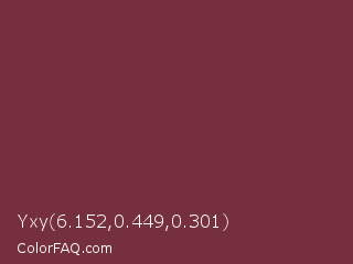 Yxy 6.152,0.449,0.301 Color is a normal red color and the nearest color is Wine #722f37. Hex code #752f3d and RGB value is rgb(117,47,61). In RGB color space, this color is composed of 46% red, 18% green, 24% blue, In CMYK color space, this color is composed of 0% cyan, 60% magenta, 48% yellow , 54% black , In HSL color space, this color has a hue angle of 348° , 43% saturation and 32% lightness.