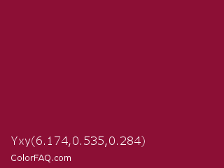 Yxy 6.174,0.535,0.284 Color is a dark rose color and the nearest color is Claret #7f1734. Hex code #8c0f35 and RGB value is rgb(140,15,53). In RGB color space, this color is composed of 55% red, 6% green, 21% blue, In CMYK color space, this color is composed of 0% cyan, 89% magenta, 62% yellow , 45% black , In HSL color space, this color has a hue angle of 342° , 81% saturation and 30% lightness.