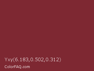 Yxy 6.183,0.502,0.312 Color is a normal red color and the nearest color is Wine #722f37. Hex code #7e2832 and RGB value is rgb(126,40,50). In RGB color space, this color is composed of 49% red, 16% green, 20% blue, In CMYK color space, this color is composed of 0% cyan, 68% magenta, 60% yellow , 51% black , In HSL color space, this color has a hue angle of 353° , 52% saturation and 33% lightness.