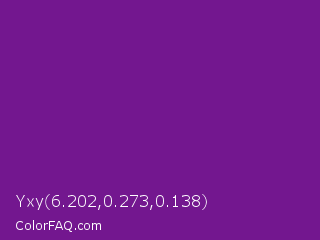 Yxy 6.202,0.273,0.138 Color is a normal purple color and the nearest color is Seance #731e8f. Hex code #73178f and RGB value is rgb(115,23,143). In RGB color space, this color is composed of 45% red, 9% green, 56% blue, In CMYK color space, this color is composed of 20% cyan, 84% magenta, 0% yellow , 44% black , In HSL color space, this color has a hue angle of 286° , 72% saturation and 33% lightness.