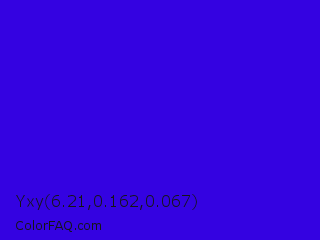 Yxy 6.21,0.162,0.067 Color is a normal indigo color and the nearest color is Interdimensional Blue #360ccc. Hex code #3402e1 and RGB value is rgb(52,2,225). In RGB color space, this color is composed of 20% red, 1% green, 88% blue, In CMYK color space, this color is composed of 77% cyan, 99% magenta, 0% yellow , 12% black , In HSL color space, this color has a hue angle of 253° , 98% saturation and 45% lightness.