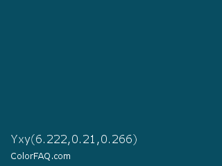 Yxy 6.222,0.21,0.266 Color is a very dark cyan color and the nearest color is Deep Sea Green #095859. Hex code #084d61 and RGB value is rgb(8,77,97). In RGB color space, this color is composed of 3% red, 30% green, 38% blue, In CMYK color space, this color is composed of 92% cyan, 21% magenta, 0% yellow , 62% black , In HSL color space, this color has a hue angle of 193° , 85% saturation and 21% lightness.