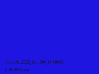 Yxy 6.232,0.156,0.068 Color is a normal indigo color and the nearest color is Bluebonnet #1c1cf0. Hex code #1e16e0 and RGB value is rgb(30,22,224). In RGB color space, this color is composed of 12% red, 9% green, 88% blue, In CMYK color space, this color is composed of 87% cyan, 90% magenta, 0% yellow , 12% black , In HSL color space, this color has a hue angle of 242° , 82% saturation and 48% lightness.