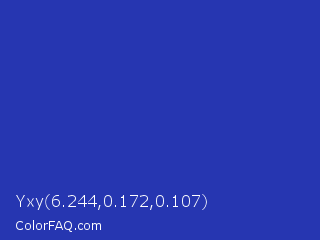 Yxy 6.244,0.172,0.107 Color is a normal blue color and the nearest color is Governor Bay #2f3cb3. Hex code #2636b1 and RGB value is rgb(38,54,177). In RGB color space, this color is composed of 15% red, 21% green, 69% blue, In CMYK color space, this color is composed of 79% cyan, 69% magenta, 0% yellow , 31% black , In HSL color space, this color has a hue angle of 233° , 65% saturation and 42% lightness.