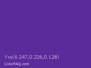 Yxy 6.247,0.226,0.128 Color is a normal violet color and the nearest color is Daisy Bush #4f2398. Hex code #5b2a9b and RGB value is rgb(91,42,155). In RGB color space, this color is composed of 36% red, 16% green, 61% blue, In CMYK color space, this color is composed of 41% cyan, 73% magenta, 0% yellow , 39% black , In HSL color space, this color has a hue angle of 266° , 57% saturation and 39% lightness.