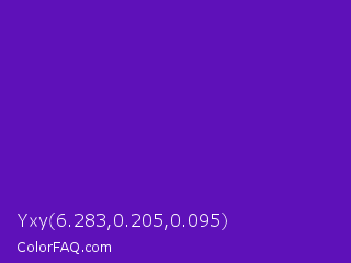 Yxy 6.283,0.205,0.095 Color is a normal violet color and the nearest color is Purple Heart Crayola #652dc1. Hex code #5e11b9 and RGB value is rgb(94,17,185). In RGB color space, this color is composed of 37% red, 7% green, 73% blue, In CMYK color space, this color is composed of 49% cyan, 91% magenta, 0% yellow , 27% black , In HSL color space, this color has a hue angle of 268° , 83% saturation and 40% lightness.