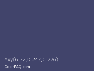 Yxy 6.32,0.247,0.226 Color is a normal blue color and the nearest color is Fiord #405169. Hex code #41446b and RGB value is rgb(65,68,107). In RGB color space, this color is composed of 25% red, 27% green, 42% blue, In CMYK color space, this color is composed of 39% cyan, 36% magenta, 0% yellow , 58% black , In HSL color space, this color has a hue angle of 236° , 24% saturation and 34% lightness.