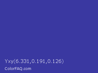 Yxy 6.331,0.191,0.126 Color is a normal indigo color and the nearest color is Blue Pigment #333399. Hex code #3a38a1 and RGB value is rgb(58,56,161). In RGB color space, this color is composed of 23% red, 22% green, 63% blue, In CMYK color space, this color is composed of 64% cyan, 65% magenta, 0% yellow , 37% black , In HSL color space, this color has a hue angle of 241° , 48% saturation and 43% lightness.