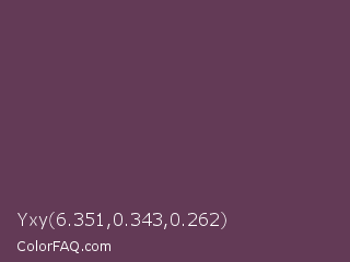 Yxy 6.351,0.343,0.262 Color is a normal magenta color and the nearest color is Ube Halaya #663854. Hex code #633a56 and RGB value is rgb(99,58,86). In RGB color space, this color is composed of 39% red, 23% green, 34% blue, In CMYK color space, this color is composed of 0% cyan, 41% magenta, 13% yellow , 61% black , In HSL color space, this color has a hue angle of 319° , 26% saturation and 31% lightness.