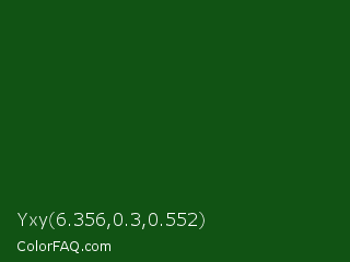 Yxy 6.356,0.3,0.552 Color is a very dark green color and the nearest color is Parsley #134f19. Hex code #115314 and RGB value is rgb(17,83,20). In RGB color space, this color is composed of 7% red, 33% green, 8% blue, In CMYK color space, this color is composed of 80% cyan, 0% magenta, 76% yellow , 67% black , In HSL color space, this color has a hue angle of 123° , 66% saturation and 20% lightness.