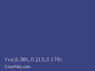Yxy 6.381,0.215,0.179 Color is a normal blue color and the nearest color is East Bay #414c7d. Hex code #3a4281 and RGB value is rgb(58,66,129). In RGB color space, this color is composed of 23% red, 26% green, 51% blue, In CMYK color space, this color is composed of 55% cyan, 49% magenta, 0% yellow , 49% black , In HSL color space, this color has a hue angle of 233° , 38% saturation and 37% lightness.