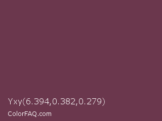 Yxy 6.394,0.382,0.279 Color is a normal rose color and the nearest color is Ube Halaya #663854. Hex code #6b374d and RGB value is rgb(107,55,77). In RGB color space, this color is composed of 42% red, 22% green, 30% blue, In CMYK color space, this color is composed of 0% cyan, 49% magenta, 28% yellow , 58% black , In HSL color space, this color has a hue angle of 335° , 32% saturation and 32% lightness.