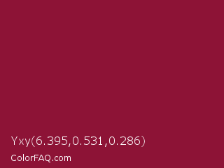Yxy 6.395,0.531,0.286 Color is a normal rose color and the nearest color is Claret #7f1734. Hex code #8d1336 and RGB value is rgb(141,19,54). In RGB color space, this color is composed of 55% red, 7% green, 21% blue, In CMYK color space, this color is composed of 0% cyan, 87% magenta, 62% yellow , 45% black , In HSL color space, this color has a hue angle of 343° , 76% saturation and 31% lightness.