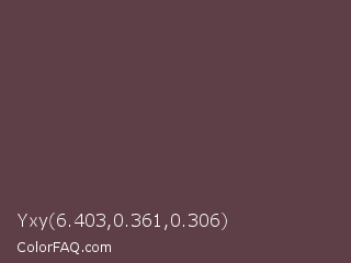 Yxy 6.403,0.361,0.306 Color is a normal rose color and the nearest color is Eggplant #614051. Hex code #5e3f48 and RGB value is rgb(94,63,72). In RGB color space, this color is composed of 37% red, 25% green, 28% blue, In CMYK color space, this color is composed of 0% cyan, 33% magenta, 23% yellow , 63% black , In HSL color space, this color has a hue angle of 343° , 20% saturation and 31% lightness.