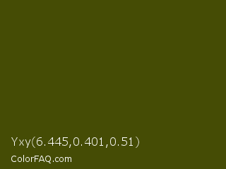 Yxy 6.445,0.401,0.51 Color is a very dark yellow color and the nearest color is Verdun Green #495400. Hex code #454c05 and RGB value is rgb(69,76,5). In RGB color space, this color is composed of 27% red, 30% green, 2% blue, In CMYK color space, this color is composed of 9% cyan, 0% magenta, 93% yellow , 70% black , In HSL color space, this color has a hue angle of 66° , 88% saturation and 16% lightness.