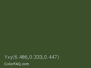 Yxy 6.486,0.333,0.447 Color is a dark green color and the nearest color is Kombu Green #354230. Hex code #394e2a and RGB value is rgb(57,78,42). In RGB color space, this color is composed of 22% red, 31% green, 16% blue, In CMYK color space, this color is composed of 27% cyan, 0% magenta, 46% yellow , 69% black , In HSL color space, this color has a hue angle of 95° , 30% saturation and 24% lightness.
