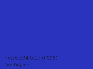 Yxy 6.534,0.17,0.098 Color is a normal blue color and the nearest color is Governor Bay #2f3cb3. Hex code #2a33bd and RGB value is rgb(42,51,189). In RGB color space, this color is composed of 16% red, 20% green, 74% blue, In CMYK color space, this color is composed of 78% cyan, 73% magenta, 0% yellow , 26% black , In HSL color space, this color has a hue angle of 236° , 64% saturation and 45% lightness.