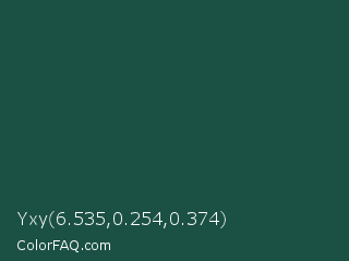 Yxy 6.535,0.254,0.374 Color is a very dark cyan color and the nearest color is Brunswick Green #1b4d3e. Hex code #1b5144 and RGB value is rgb(27,81,68). In RGB color space, this color is composed of 11% red, 32% green, 27% blue, In CMYK color space, this color is composed of 67% cyan, 0% magenta, 16% yellow , 68% black , In HSL color space, this color has a hue angle of 166° , 50% saturation and 21% lightness.