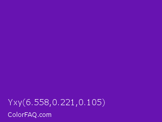 Yxy 6.558,0.221,0.105 Color is a normal purple color and the nearest color is Grape #6f2da8. Hex code #6713b1 and RGB value is rgb(103,19,177). In RGB color space, this color is composed of 40% red, 7% green, 69% blue, In CMYK color space, this color is composed of 42% cyan, 89% magenta, 0% yellow , 31% black , In HSL color space, this color has a hue angle of 272° , 81% saturation and 38% lightness.