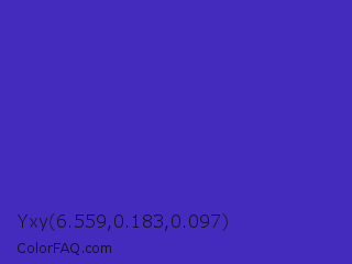 Yxy 6.559,0.183,0.097 Color is a normal indigo color and the nearest color is Ocean Blue #4f42b5. Hex code #442abd and RGB value is rgb(68,42,189). In RGB color space, this color is composed of 27% red, 16% green, 74% blue, In CMYK color space, this color is composed of 64% cyan, 78% magenta, 0% yellow , 26% black , In HSL color space, this color has a hue angle of 251° , 64% saturation and 45% lightness.
