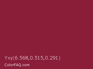 Yxy 6.568,0.515,0.291 Color is a normal red color and the nearest color is Antique Ruby #841b2d. Hex code #8a1d38 and RGB value is rgb(138,29,56). In RGB color space, this color is composed of 54% red, 11% green, 22% blue, In CMYK color space, this color is composed of 0% cyan, 79% magenta, 59% yellow , 46% black , In HSL color space, this color has a hue angle of 345° , 65% saturation and 33% lightness.
