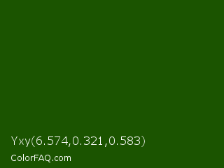 Yxy 6.574,0.321,0.583 Color is a very dark green color and the nearest color is Lincoln Green #195905. Hex code #1b5400 and RGB value is rgb(27,84,0). In RGB color space, this color is composed of 11% red, 33% green, 0% blue, In CMYK color space, this color is composed of 68% cyan, 0% magenta, 100% yellow , 67% black , In HSL color space, this color has a hue angle of 101° , 100% saturation and 16% lightness.