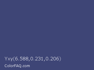 Yxy 6.588,0.231,0.206 Color is a normal blue color and the nearest color is East Bay #414c7d. Hex code #3e4576 and RGB value is rgb(62,69,118). In RGB color space, this color is composed of 24% red, 27% green, 46% blue, In CMYK color space, this color is composed of 47% cyan, 42% magenta, 0% yellow , 54% black , In HSL color space, this color has a hue angle of 233° , 31% saturation and 35% lightness.