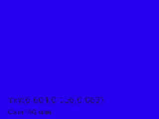 Yxy 6.604,0.156,0.063 Color is a normal indigo color and the nearest color is Electric Ultramarine #3f00ff. Hex code #2700ef and RGB value is rgb(39,0,239). In RGB color space, this color is composed of 15% red, 0% green, 94% blue, In CMYK color space, this color is composed of 84% cyan, 100% magenta, 0% yellow , 6% black , In HSL color space, this color has a hue angle of 250° , 100% saturation and 47% lightness.