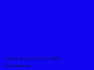 Yxy 6.621,0.152,0.062 Color is a normal indigo color and the nearest color is Blue #0000ff. Hex code #1106f1 and RGB value is rgb(17,6,241). In RGB color space, this color is composed of 7% red, 2% green, 95% blue, In CMYK color space, this color is composed of 93% cyan, 98% magenta, 0% yellow , 5% black , In HSL color space, this color has a hue angle of 243° , 95% saturation and 48% lightness.