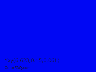 Yxy 6.623,0.15,0.061 Color is a normal blue color and the nearest color is Blue #0000ff. Hex code #0007f4 and RGB value is rgb(0,7,244). In RGB color space, this color is composed of 0% red, 3% green, 96% blue, In CMYK color space, this color is composed of 100% cyan, 97% magenta, 0% yellow , 4% black , In HSL color space, this color has a hue angle of 238° , 100% saturation and 48% lightness.