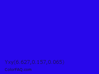 Yxy 6.627,0.157,0.065 Color is a normal indigo color and the nearest color is Bluebonnet #1c1cf0. Hex code #2807eb and RGB value is rgb(40,7,235). In RGB color space, this color is composed of 16% red, 3% green, 92% blue, In CMYK color space, this color is composed of 83% cyan, 97% magenta, 0% yellow , 8% black , In HSL color space, this color has a hue angle of 249° , 94% saturation and 47% lightness.