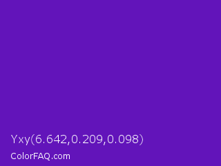 Yxy 6.642,0.209,0.098 Color is a normal violet color and the nearest color is Purple Heart Crayola #652dc1. Hex code #6214ba and RGB value is rgb(98,20,186). In RGB color space, this color is composed of 38% red, 8% green, 73% blue, In CMYK color space, this color is composed of 47% cyan, 89% magenta, 0% yellow , 27% black , In HSL color space, this color has a hue angle of 268° , 81% saturation and 40% lightness.