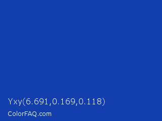 Yxy 6.691,0.169,0.118 Color is a normal blue color and the nearest color is Egyptian Blue #1034a6. Hex code #123fad and RGB value is rgb(18,63,173). In RGB color space, this color is composed of 7% red, 25% green, 68% blue, In CMYK color space, this color is composed of 90% cyan, 64% magenta, 0% yellow , 32% black , In HSL color space, this color has a hue angle of 223° , 81% saturation and 37% lightness.