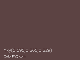 Yxy 6.695,0.365,0.329 Color is a normal red color and the nearest color is Kabul #5e483e. Hex code #5c4343 and RGB value is rgb(92,67,67). In RGB color space, this color is composed of 36% red, 26% green, 26% blue, In CMYK color space, this color is composed of 0% cyan, 27% magenta, 27% yellow , 64% black , In HSL color space, this color has a hue angle of 0° , 16% saturation and 31% lightness.