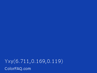 Yxy 6.711,0.169,0.119 Color is a normal blue color and the nearest color is Egyptian Blue #1034a6. Hex code #113fad and RGB value is rgb(17,63,173). In RGB color space, this color is composed of 7% red, 25% green, 68% blue, In CMYK color space, this color is composed of 90% cyan, 64% magenta, 0% yellow , 32% black , In HSL color space, this color has a hue angle of 222° , 82% saturation and 37% lightness.