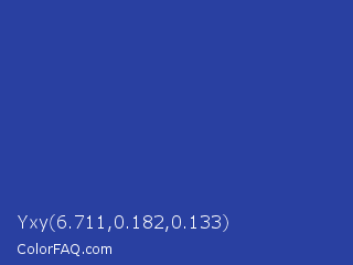 Yxy 6.711,0.182,0.133 Color is a normal blue color and the nearest color is Blue Pigment #333399. Hex code #2940a1 and RGB value is rgb(41,64,161). In RGB color space, this color is composed of 16% red, 25% green, 63% blue, In CMYK color space, this color is composed of 75% cyan, 60% magenta, 0% yellow , 37% black , In HSL color space, this color has a hue angle of 229° , 59% saturation and 40% lightness.