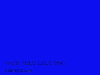 Yxy 6.718,0.152,0.064 Color is a normal blue color and the nearest color is Bluebonnet #1c1cf0. Hex code #0b11ef and RGB value is rgb(11,17,239). In RGB color space, this color is composed of 4% red, 7% green, 94% blue, In CMYK color space, this color is composed of 95% cyan, 93% magenta, 0% yellow , 6% black , In HSL color space, this color has a hue angle of 238° , 91% saturation and 49% lightness.