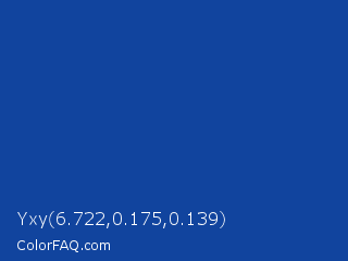 Yxy 6.722,0.175,0.139 Color is a normal blue color and the nearest color is Yale Blue #0f4d92. Hex code #11449e and RGB value is rgb(17,68,158). In RGB color space, this color is composed of 7% red, 27% green, 62% blue, In CMYK color space, this color is composed of 89% cyan, 57% magenta, 0% yellow , 38% black , In HSL color space, this color has a hue angle of 218° , 81% saturation and 34% lightness.