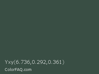 Yxy 6.736,0.292,0.361 Color is a dark green color and the nearest color is Cape Cod #3c4443. Hex code #394e44 and RGB value is rgb(57,78,68). In RGB color space, this color is composed of 22% red, 31% green, 27% blue, In CMYK color space, this color is composed of 27% cyan, 0% magenta, 13% yellow , 69% black , In HSL color space, this color has a hue angle of 151° , 16% saturation and 26% lightness.